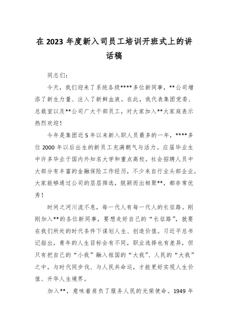 / 在2023年度新入司员工培训开班式上的讲话稿