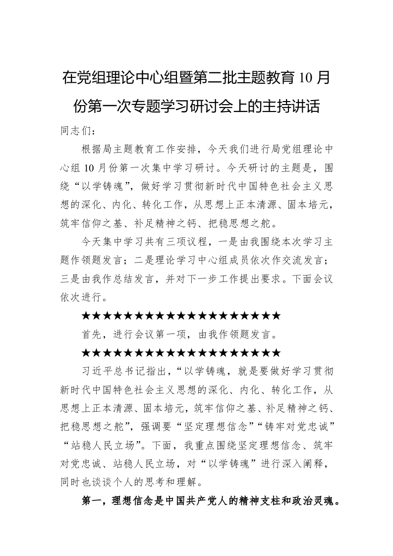 / 在党组理论中心组暨第二批主题教育10月份第一次专题学习研讨会上的主持讲话