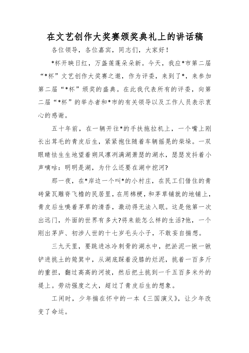 在文艺创作大奖赛颁奖典礼上的讲话稿