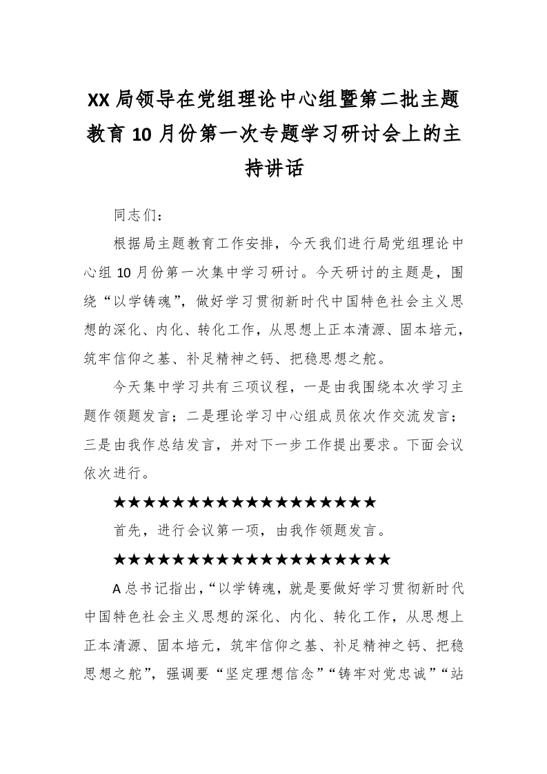 / XX局领导在党组理论中心组暨第二批主题教育10月份第一次专题学习研讨会上的主持讲话