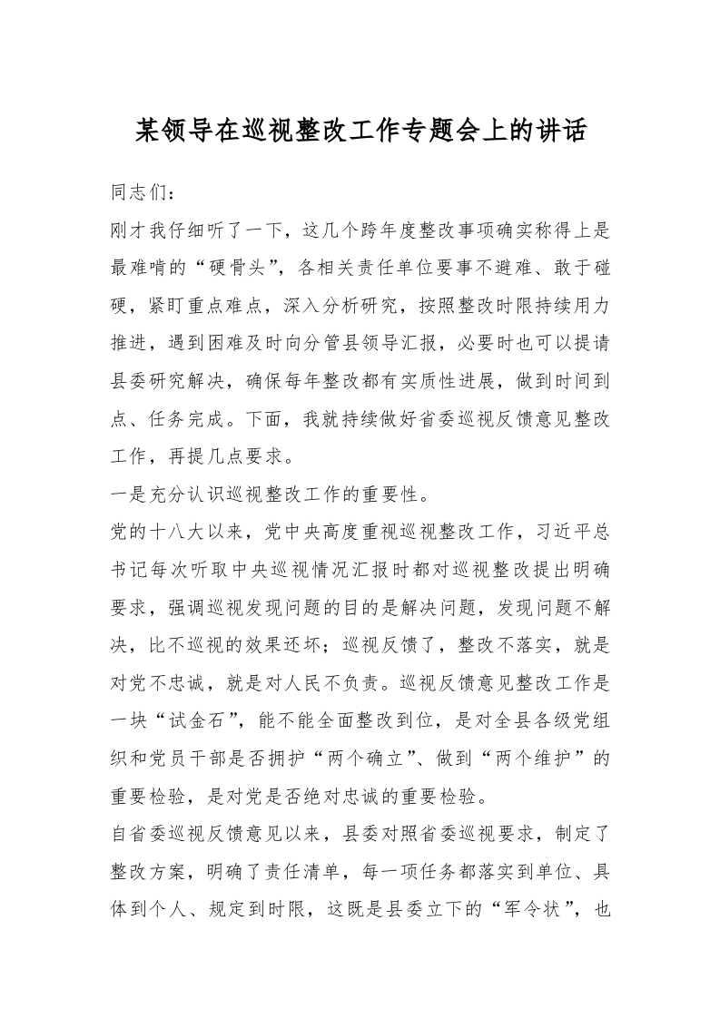 / 某领导在巡视整改工作专题会上的讲话