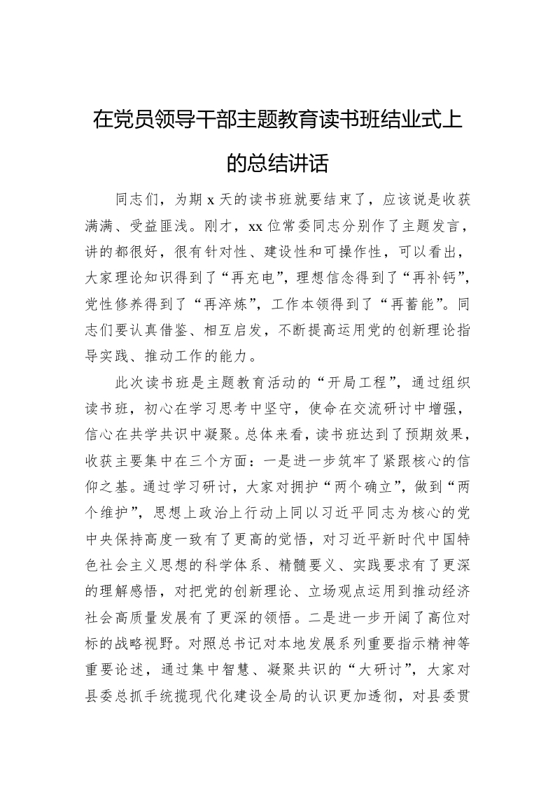 / 在党员领导干部主题教育读书班结业式上的总结讲话
