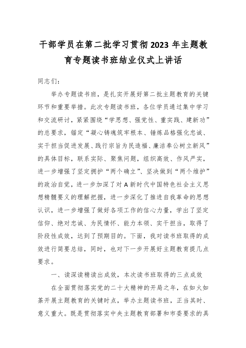 / 干部学员在第二批学习贯彻2023年主题教育专题读书班结业仪式上讲话