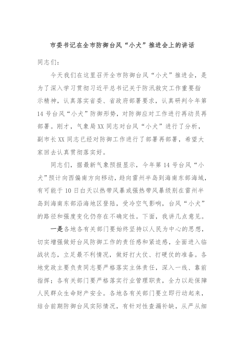 / 市委书记在全市防御台风“小犬”推进会上的讲话