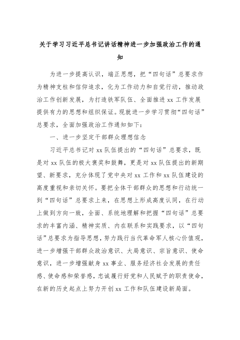 / 关于学习习近平总书记讲话精神进一步加强政治工作的通知