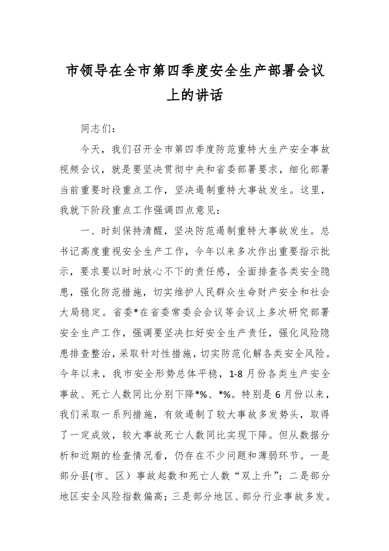 / 市领导在全市第四季度安全生产部署会议上的讲话