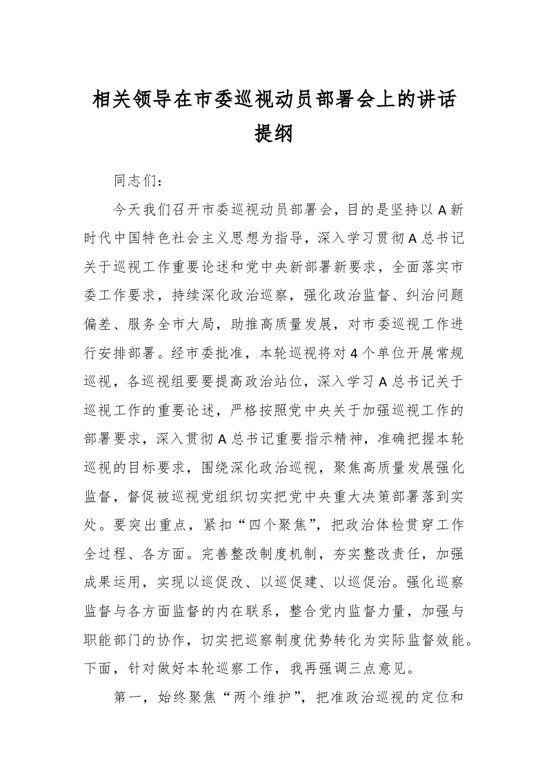 / 相关领导在市委巡视动员部署会上的讲话提纲