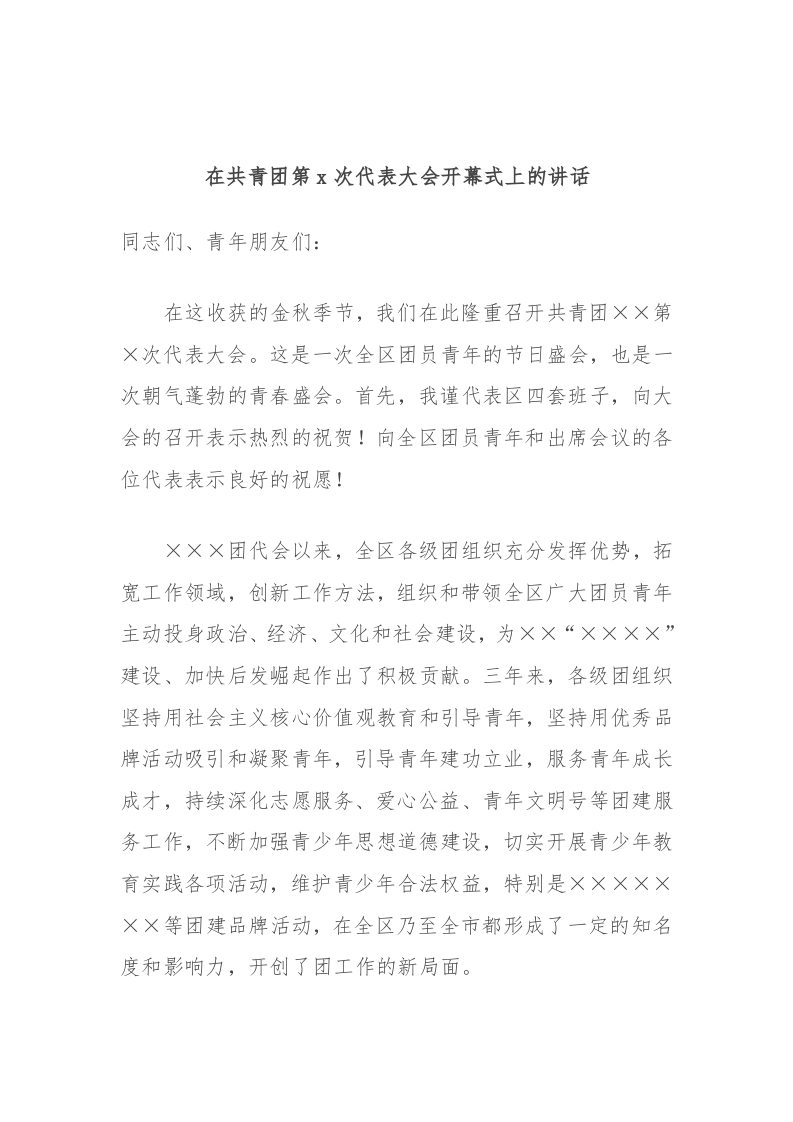 / 在共青团第x次代表大会开幕式上的讲话