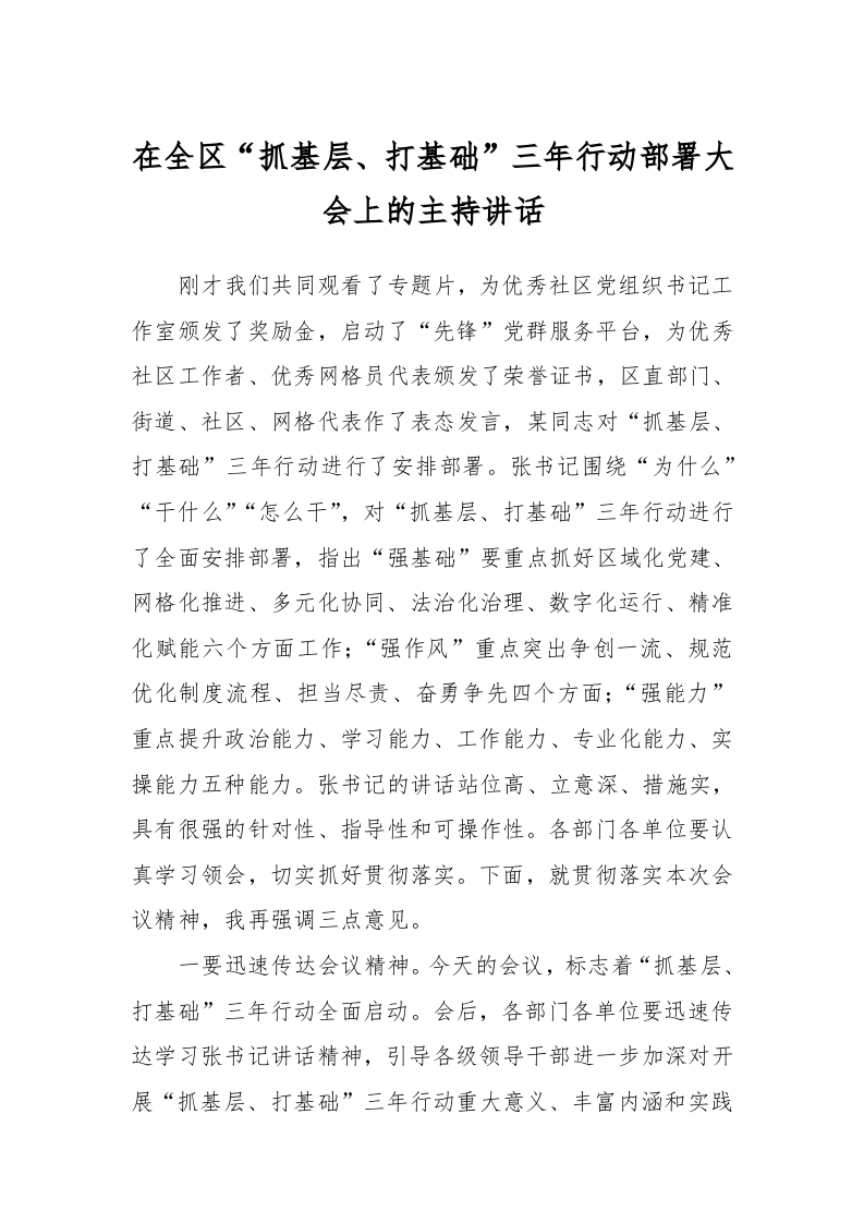 / 在全区“抓基层、打基础”三年行动部署大会上的主持讲话
