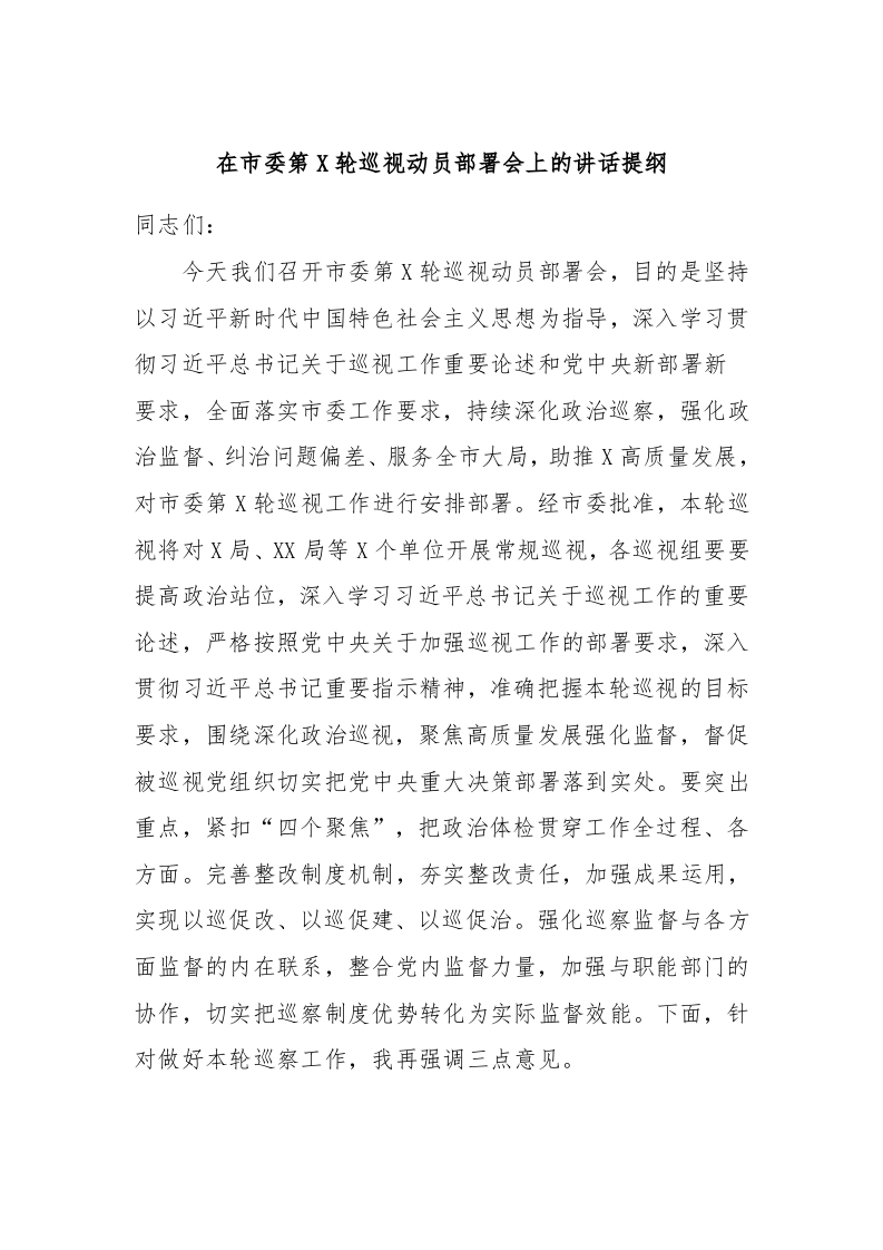 / 在市委第X轮巡视动员部署会上的讲话提纲