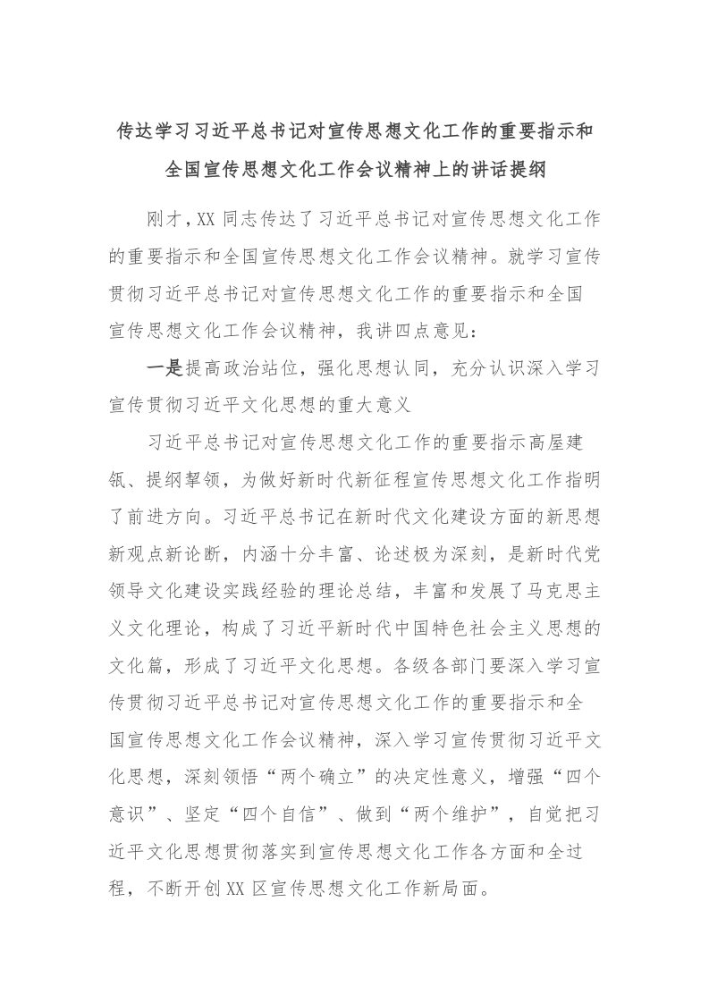 传达学习习近平总书记对宣传思想文化工作的重要指示和全国宣传思想文化工作会议精神上的讲话提纲