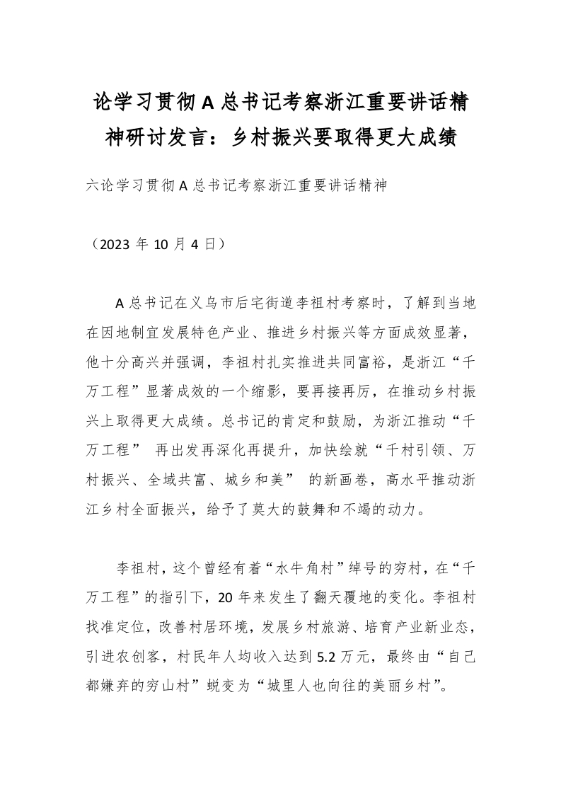 / 论学习贯彻A总书记考察浙江重要讲话精神研讨发言:乡村振兴要取得更大成绩