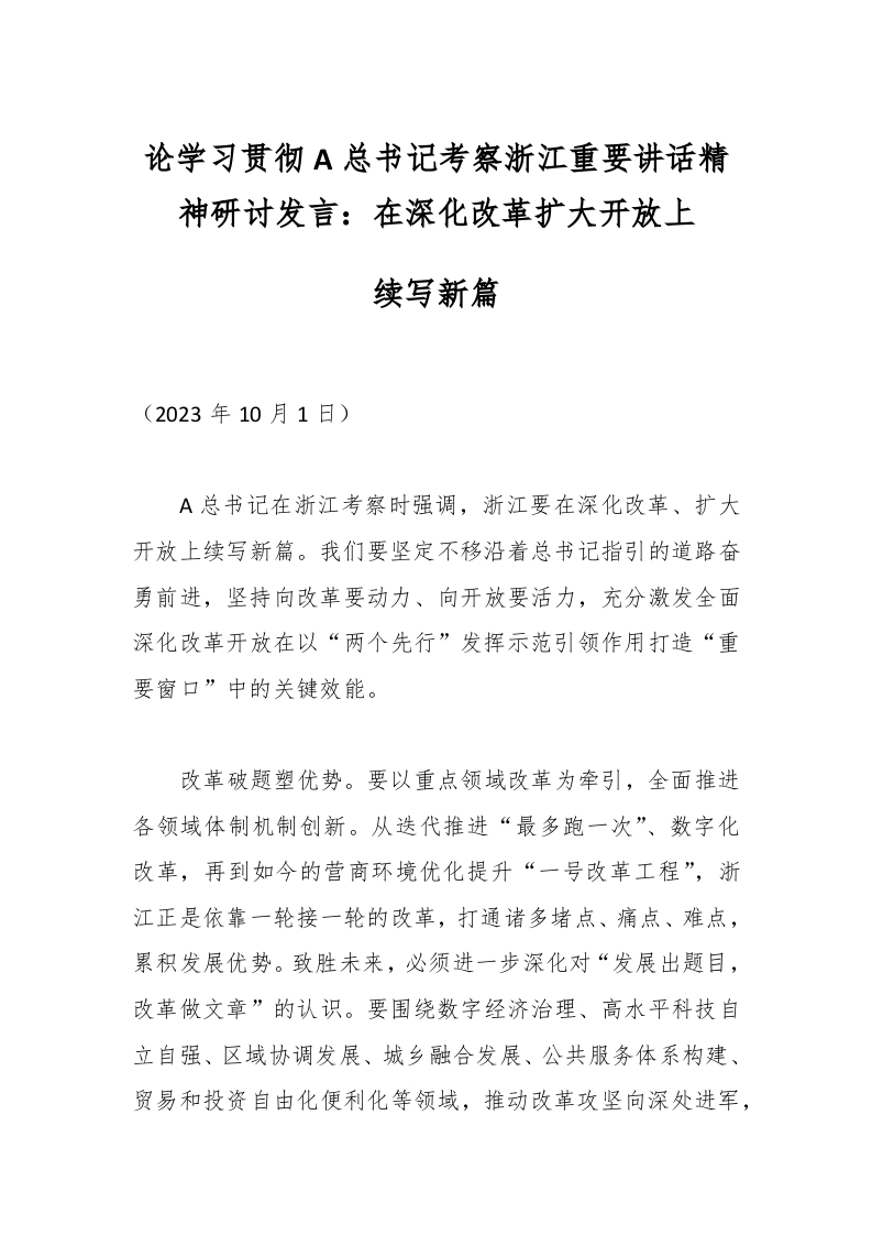 / 论学习贯彻A总书记考察浙江重要讲话精神研讨发言:在深化改革扩大开放上续写新篇
