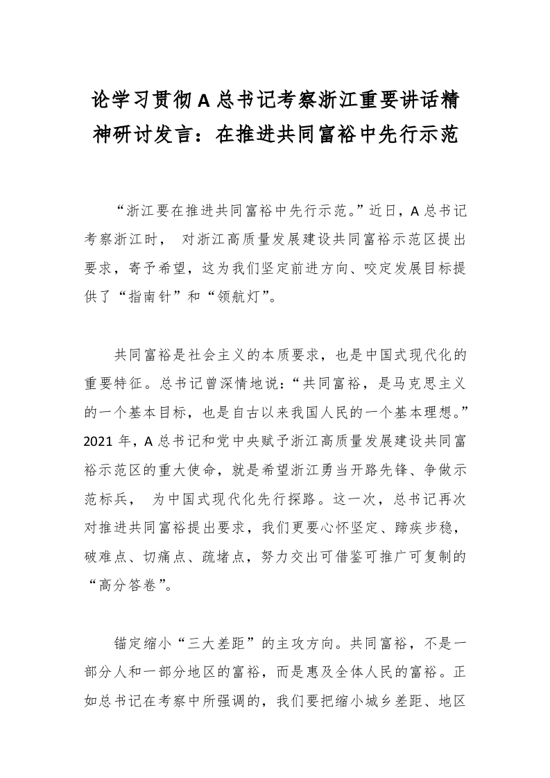 / 论学习贯彻A总书记考察浙江重要讲话精神研讨发言:在推进共同富裕中先行示范