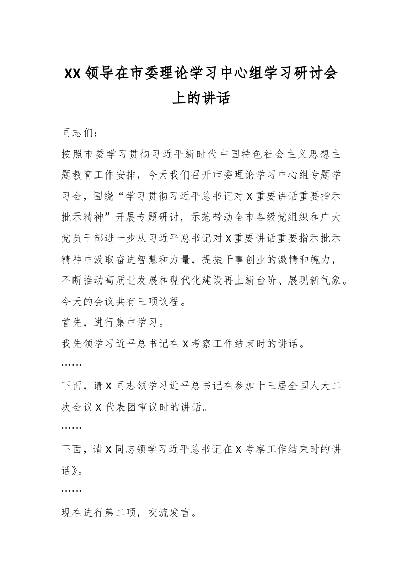 / XX领导在市委理论学习中心组学习研讨会上的讲话