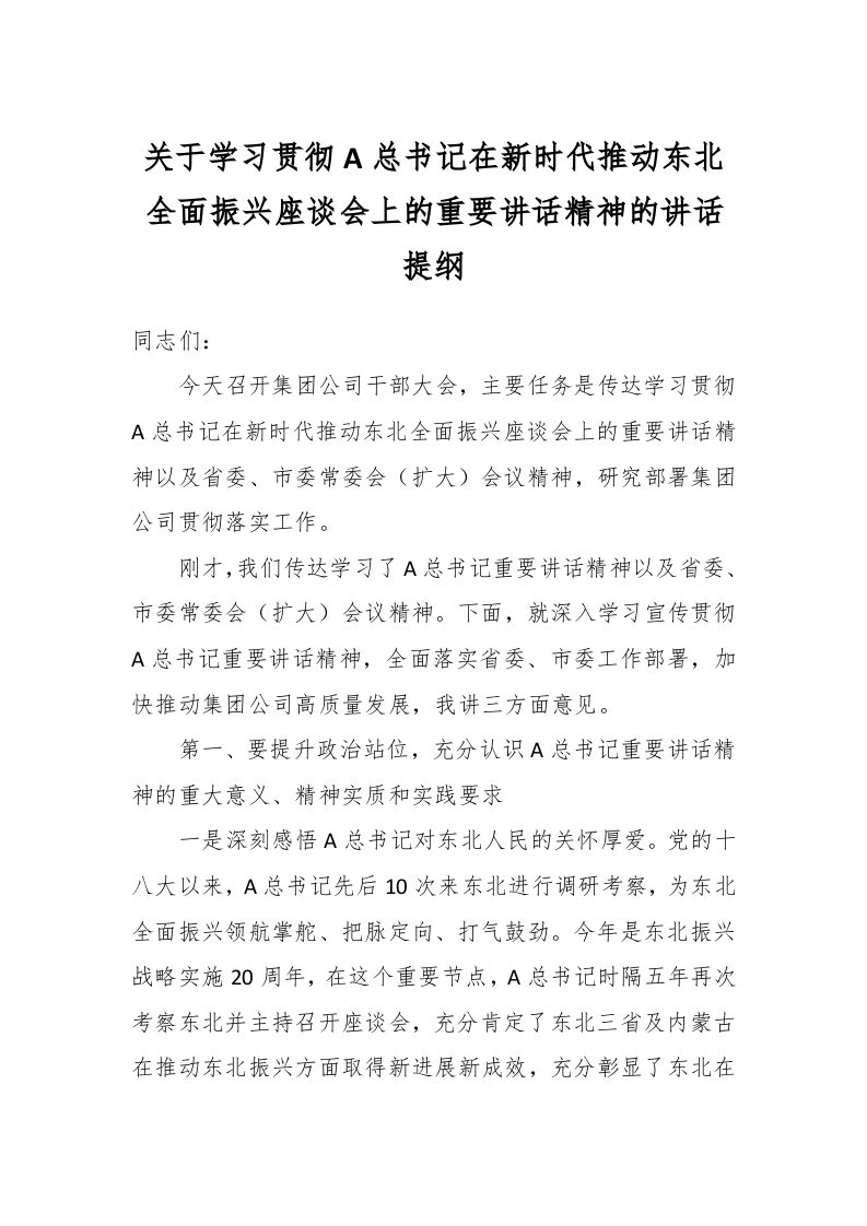 / 关于学习贯彻A总书记在新时代推动东北全面振兴座谈会上的重要讲话精神的讲话提纲