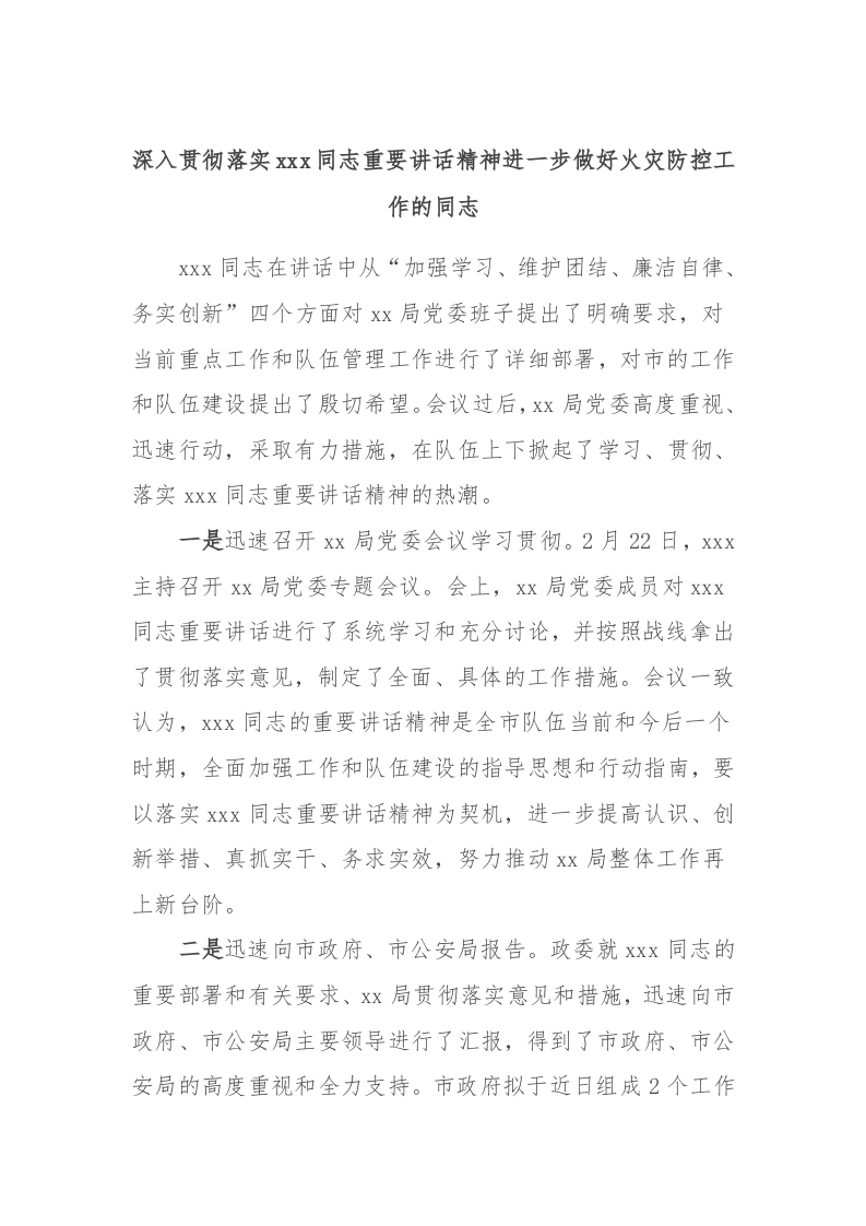 / 深入贯彻落实xxx同志重要讲话精神进一步做好火灾防控工作的同志