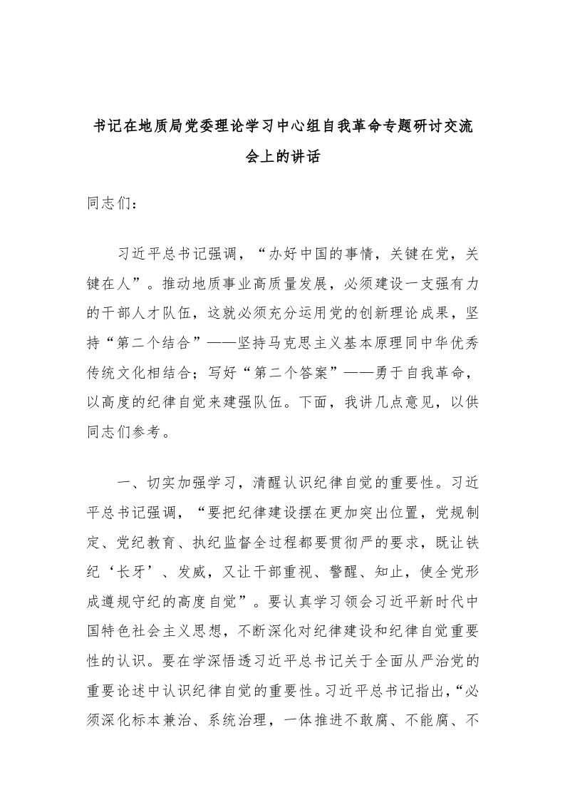 / 书记在地质局党委理论学习中心组自我革命专题研讨交流会上的讲话