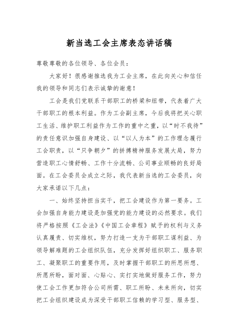 新当选工会主席表态讲话稿