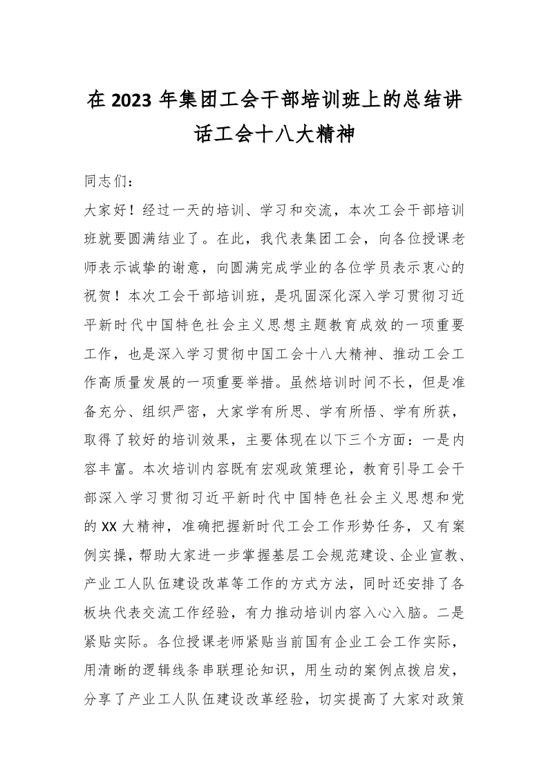 / 在2023年集团工会干部培训班上的总结讲话工会十八大精神