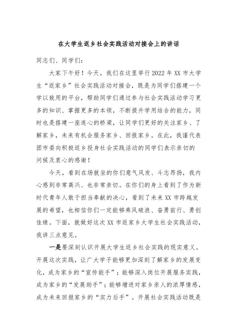 / 在大学生返乡社会实践活动对接会上的讲话