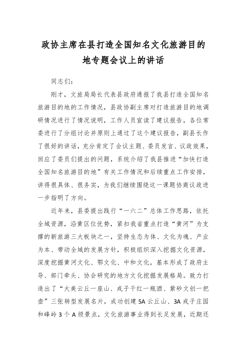 / 政协主席在县打造全国知名文化旅游目的地专题会议上的讲话