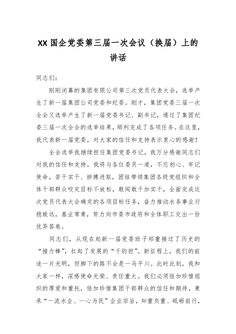 / XX国企党委第三届一次会议(换届)上的讲话