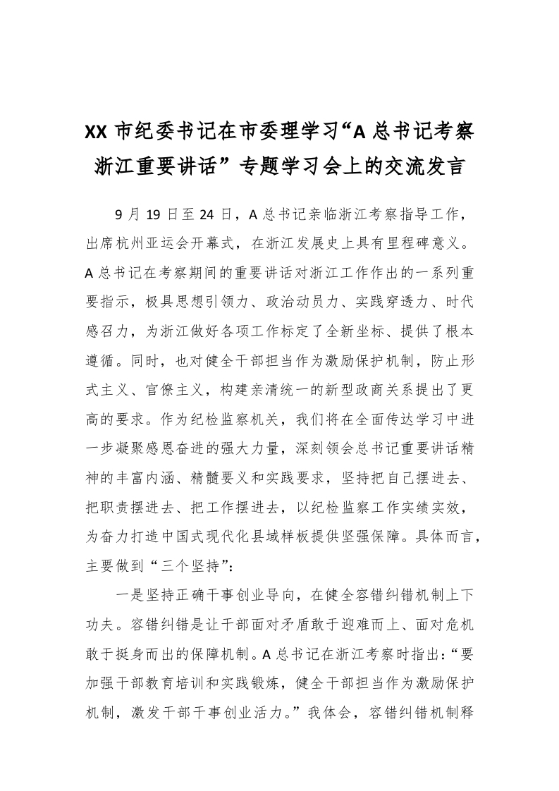 / XX市纪委书记在市委理学习“A总书记考察浙江重要讲话”专题学习会上的交流发言