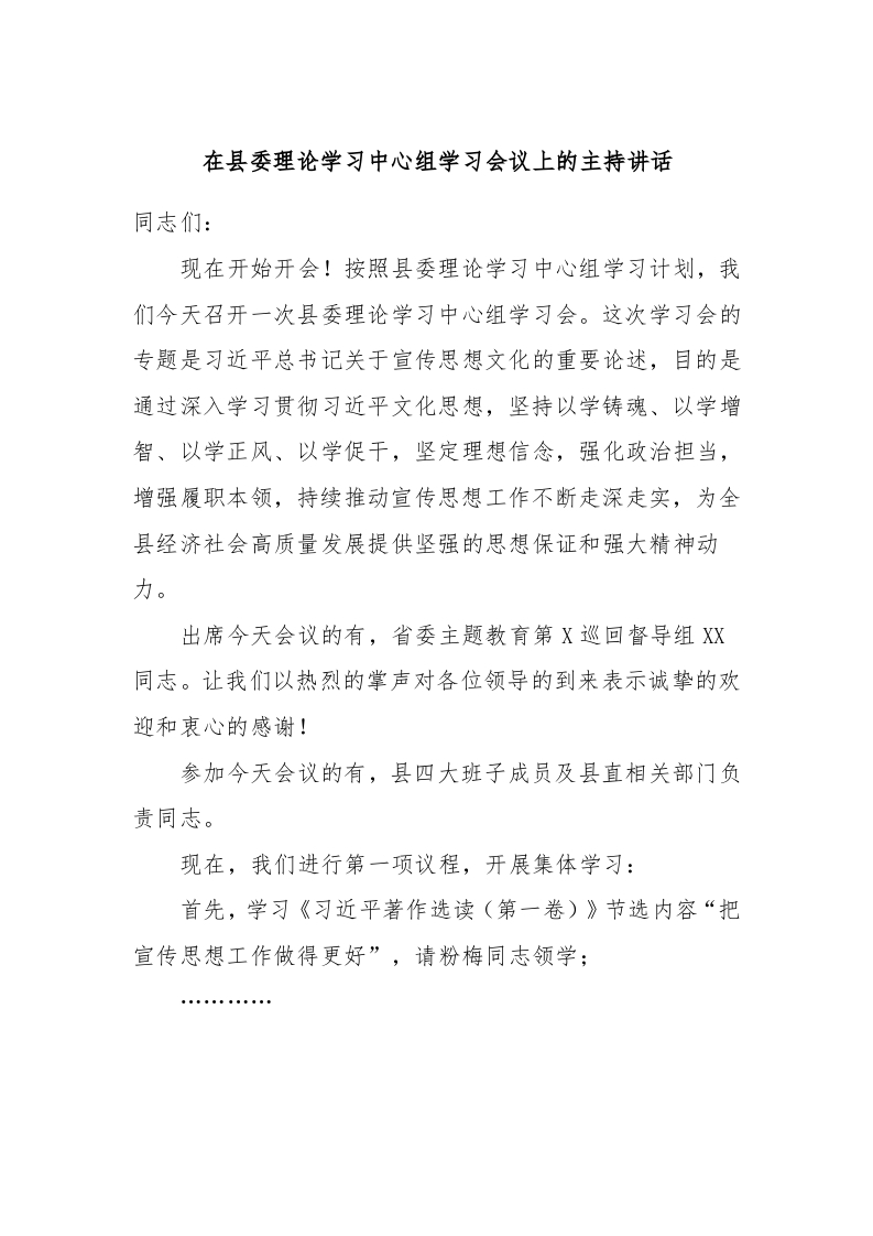 / 在县委理论学习中心组学习会议上的主持讲话