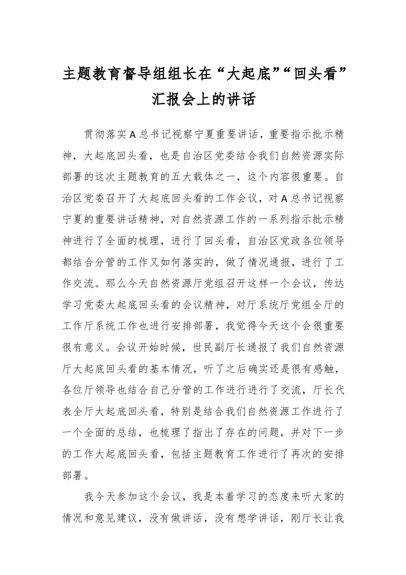 / 主题教育督导组组长在“大起底”“回头看”汇报会上的讲话