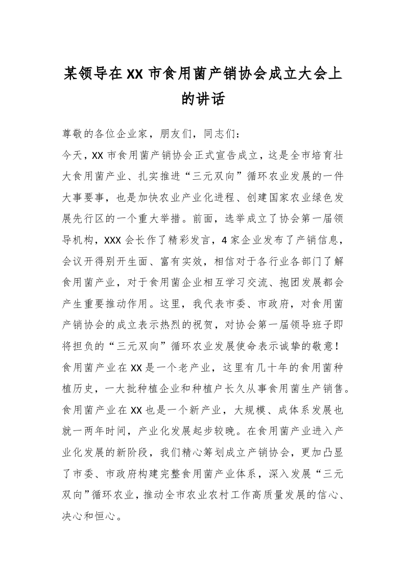 / 某领导在XX市食用菌产销协会成立大会上的讲话