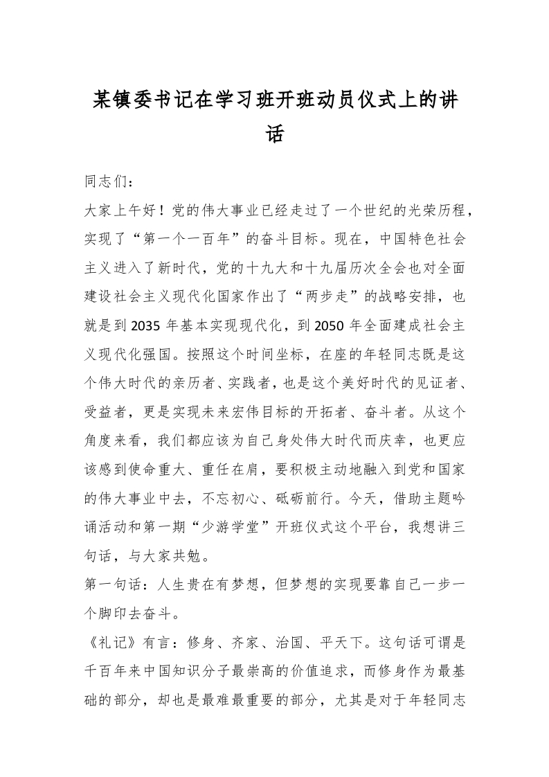 / 某镇委书记在学习班开班动员仪式上的讲话