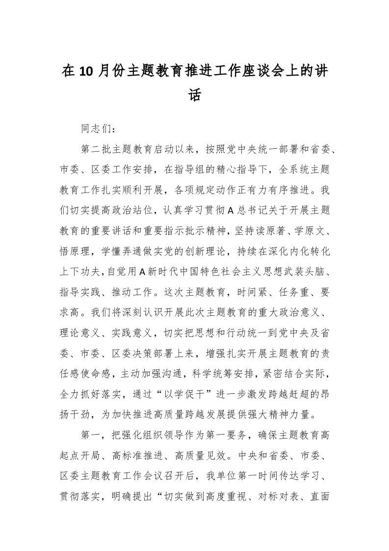 / 上级领导在10月份主题教育推进工作座谈会上的讲话