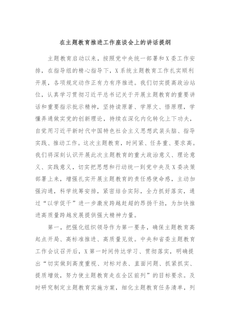 / 在主题教育推进工作座谈会上的讲话提纲