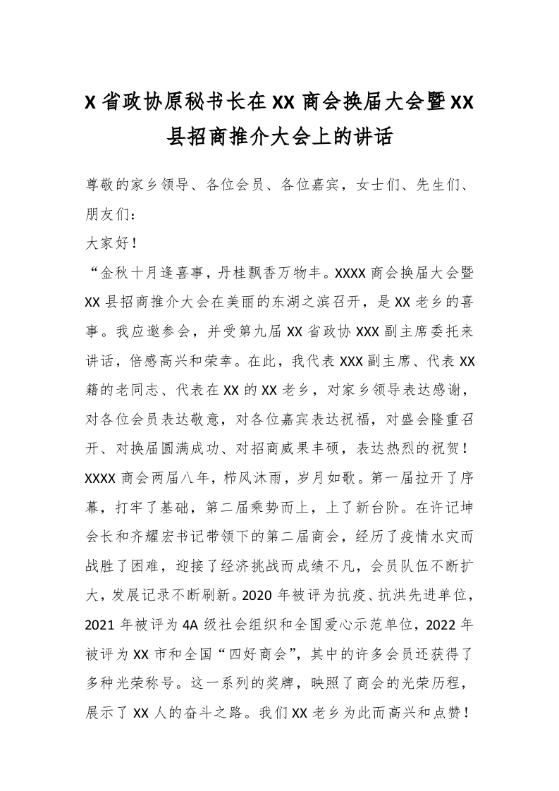 / X省政协原秘书长在XX商会换届大会暨XX县招商推介大会上的讲话
