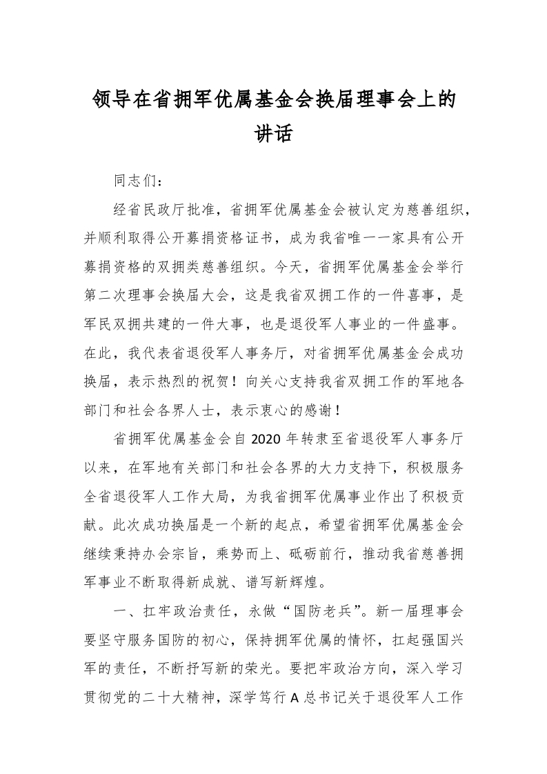 / 领导在省拥军优属基金会换届理事会上的讲话