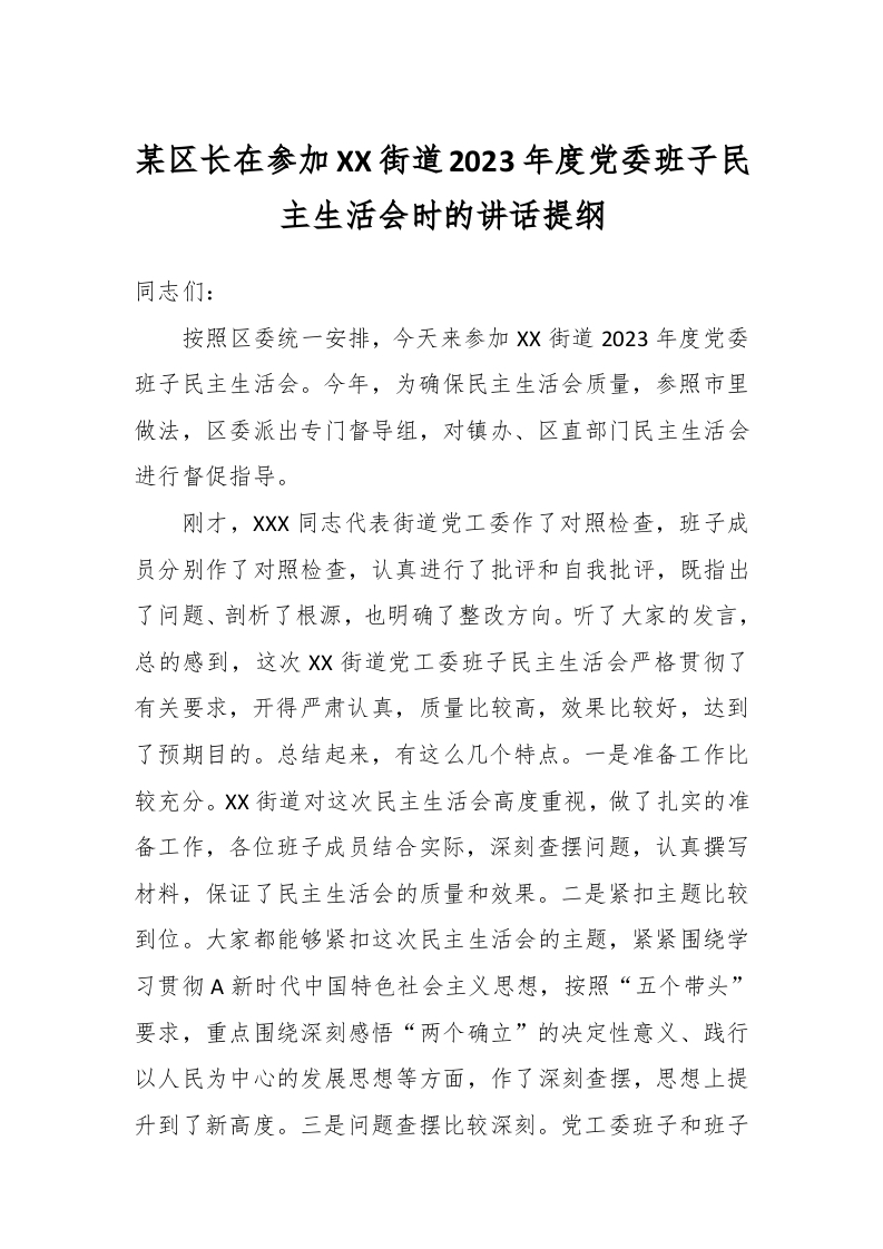 / 某区长在参加XX街道2023年度党委班子民主生活会时的讲话提纲