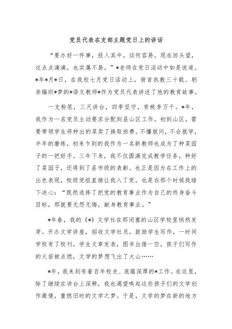 / 党员代表在支部主题党日上的讲话