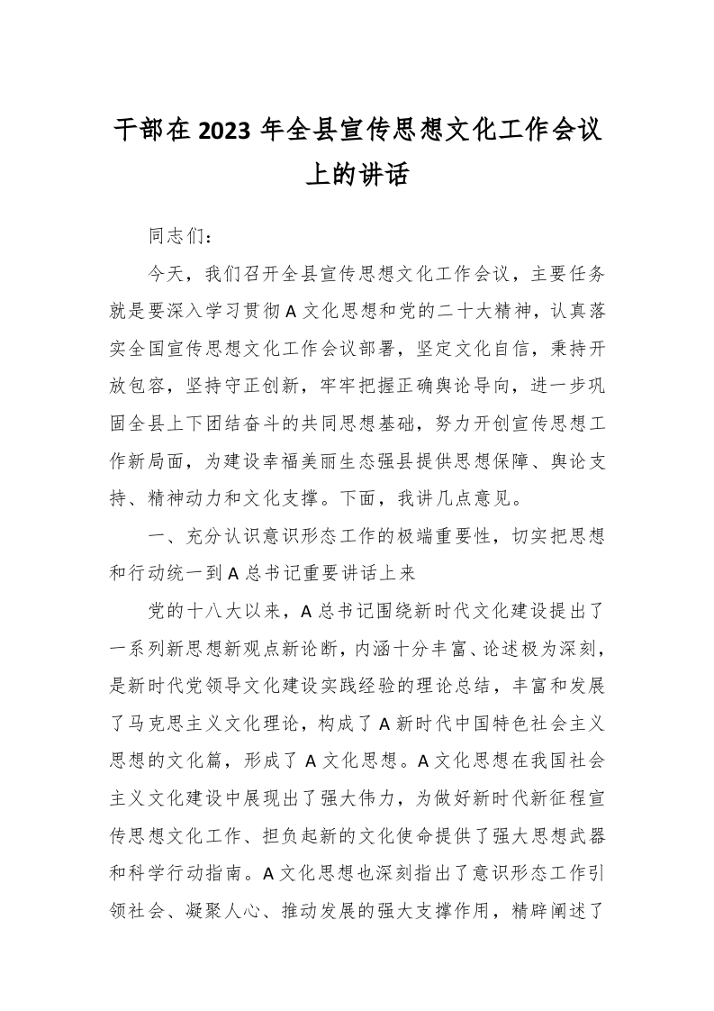 / 干部在2023年全县宣传思想文化工作会议上的讲话