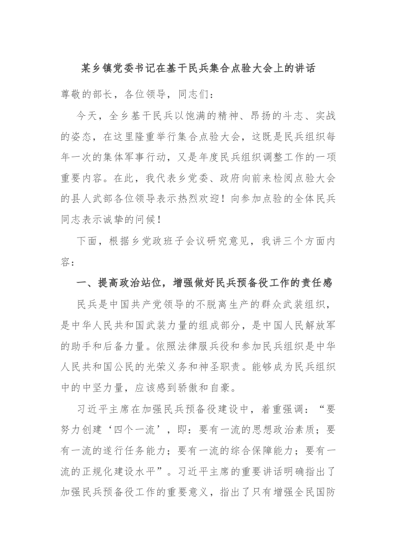 / 某乡镇党委书记在基干民兵集合点验大会上的讲话