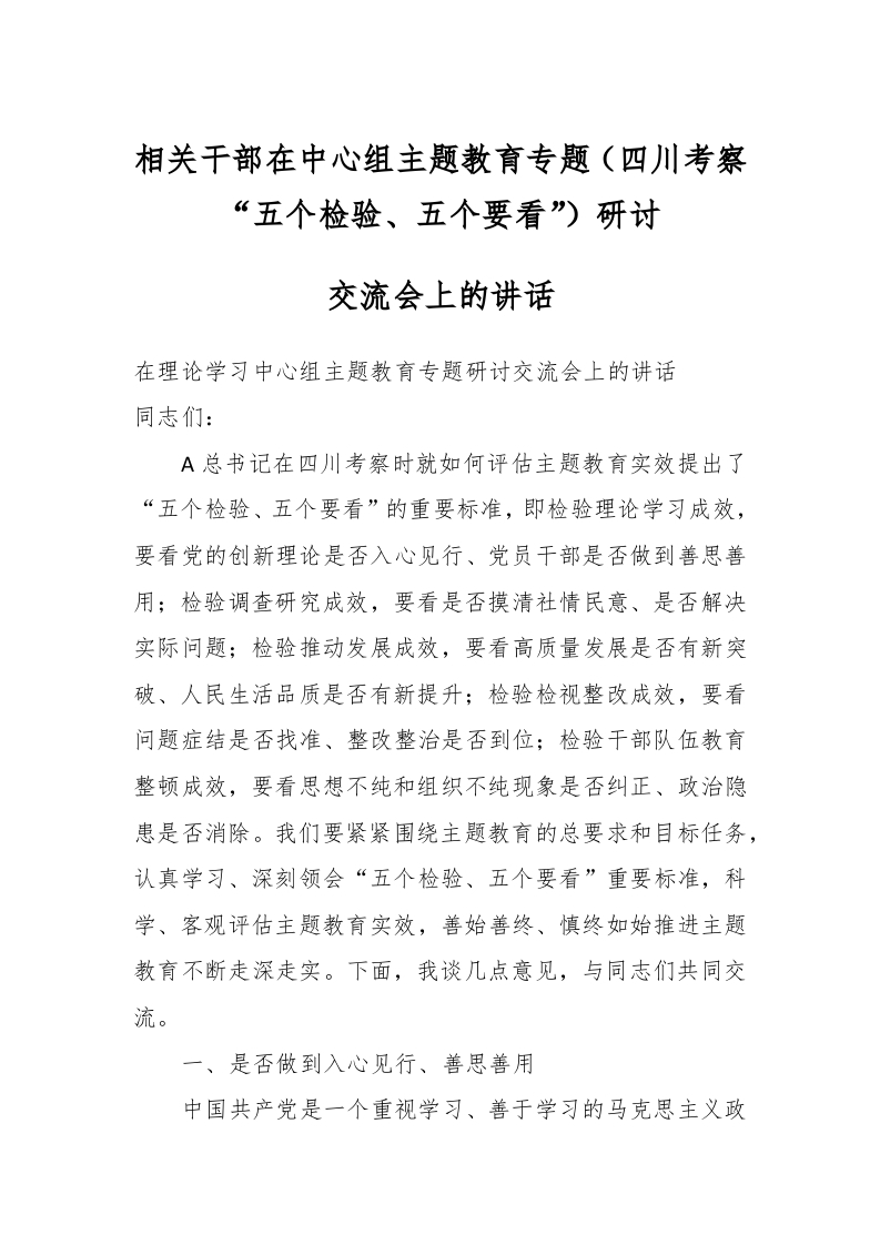 相关干部在中心组主题教育专题(四川考察“五个检验、五个要看”)研讨交流会上的讲话