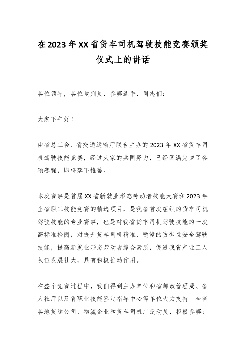 / 在2023年XX省货车司机驾驶技能竞赛颁奖仪式上的讲话