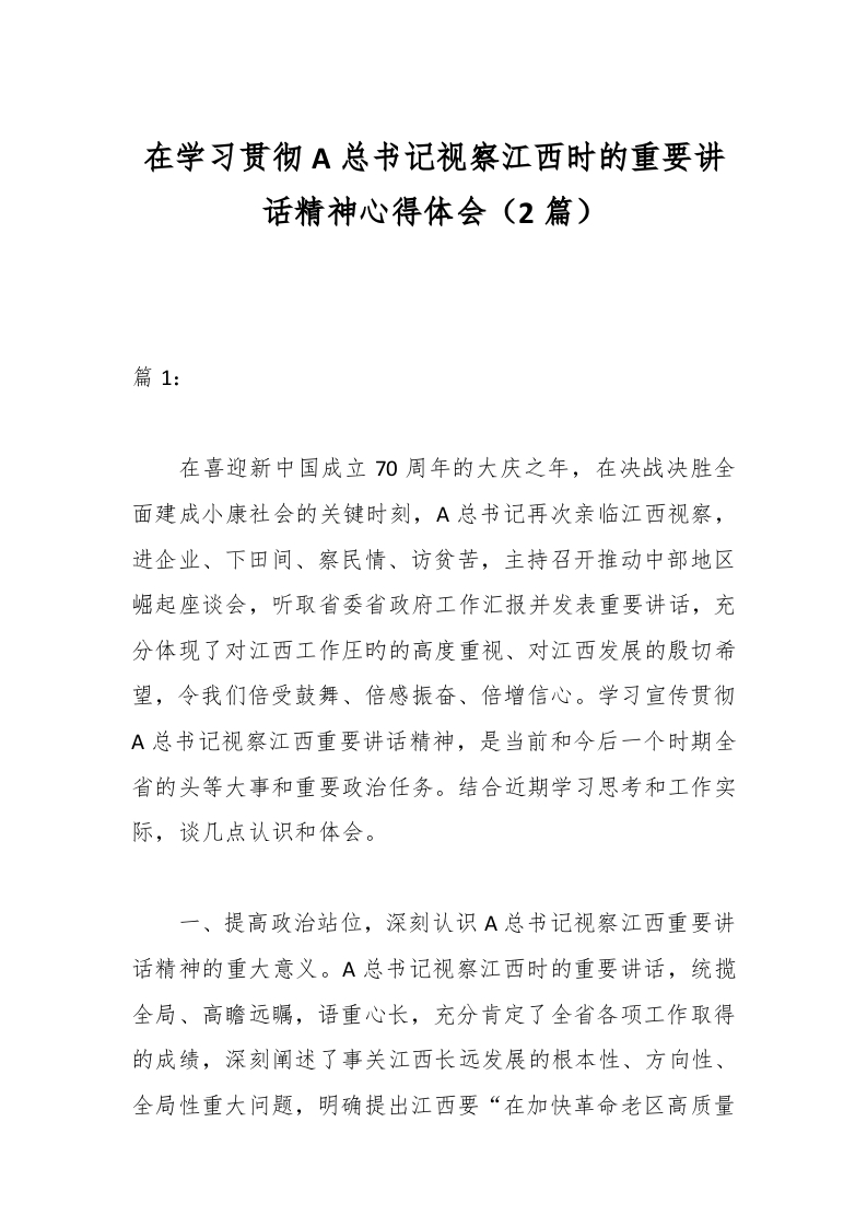 / (2篇)在学习贯彻A总书记视察江西时的重要讲话精神心得体会