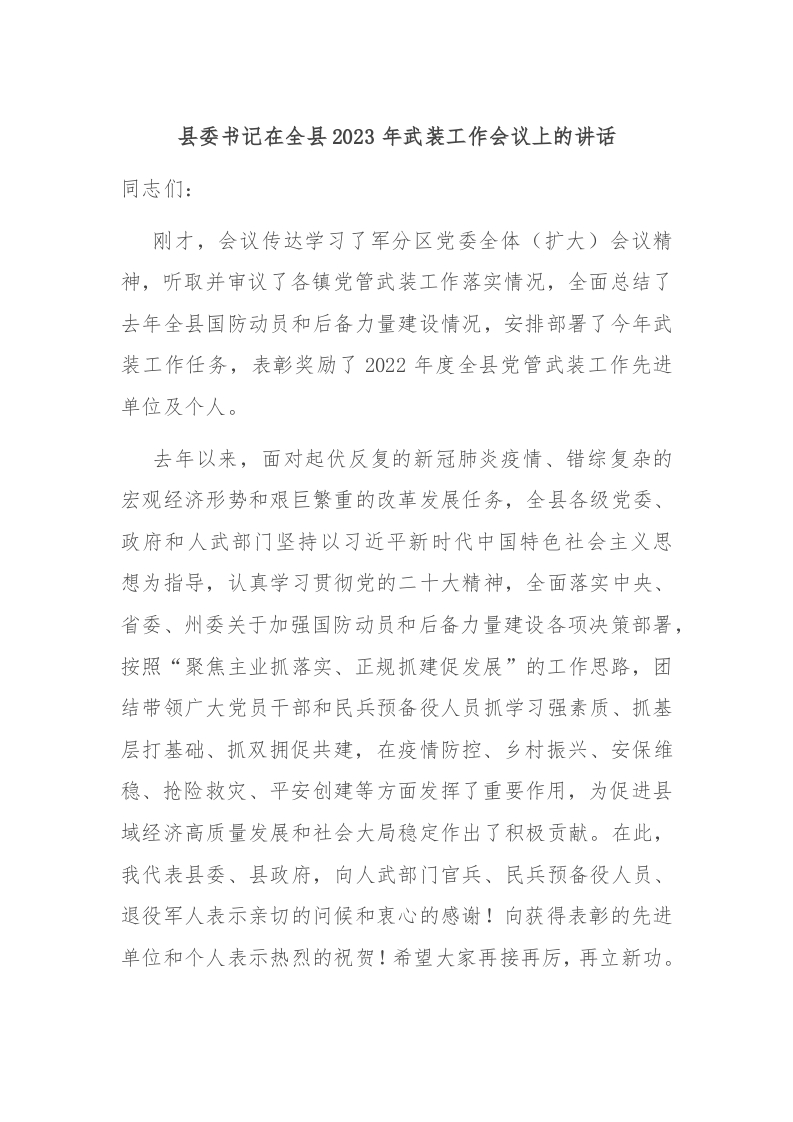 / 县委书记在全县2023年武装工作会议上的讲话