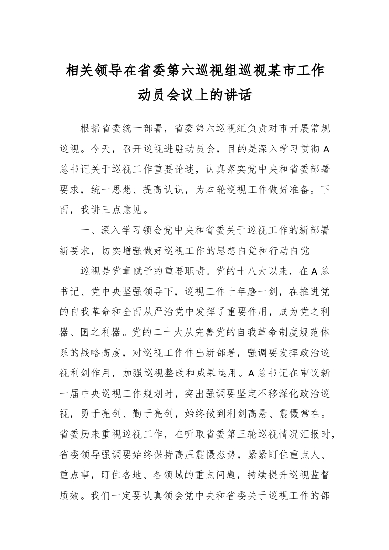 / 相关领导在省委第六巡视组巡视某市工作动员会议上的讲话