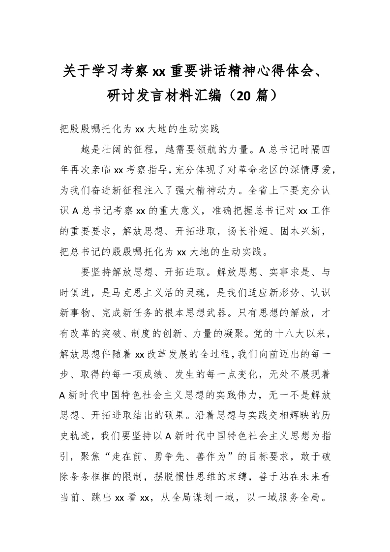/ (20篇)关于学习考察xx重要讲话精神心得体会、研讨发言材料汇编