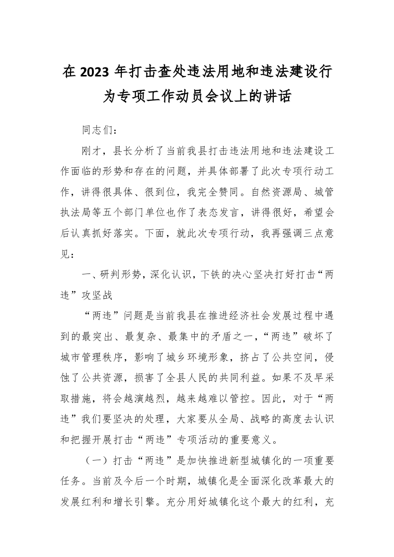 / 在2023年打击查处违法用地和违法建设行为专项工作动员会议上的讲话