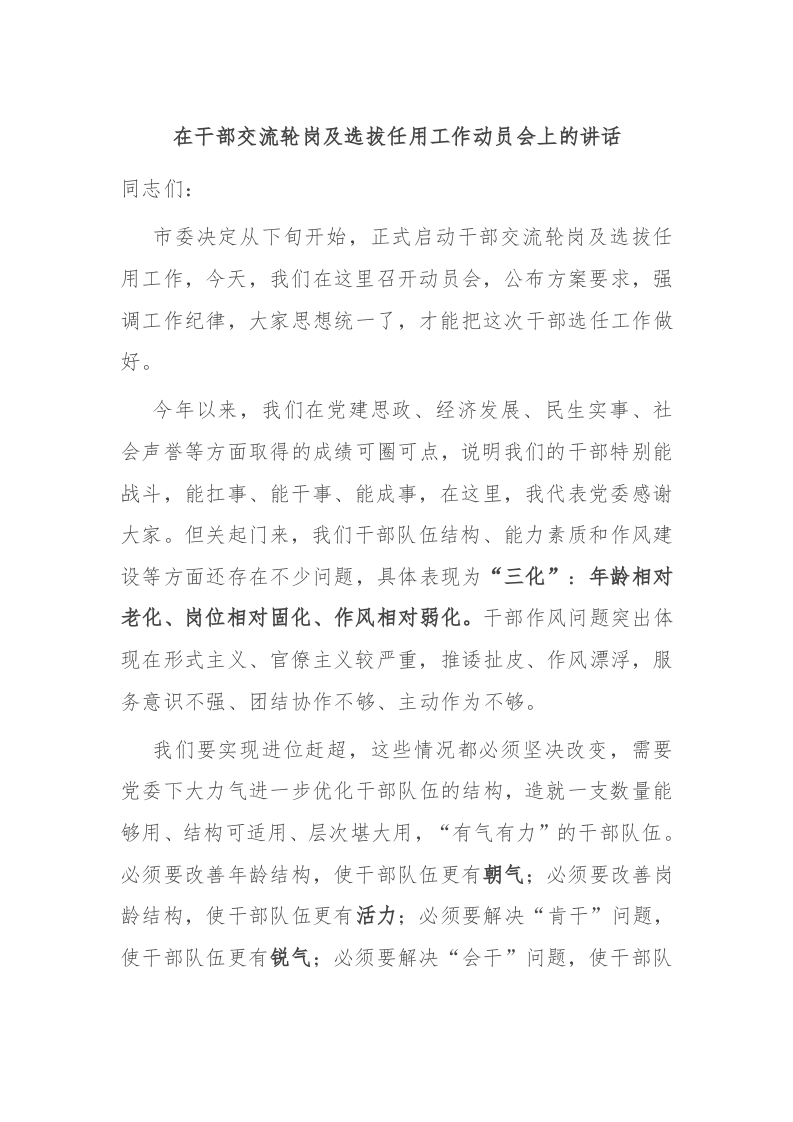 / 在干部交流轮岗及选拔任用工作动员会上的讲话