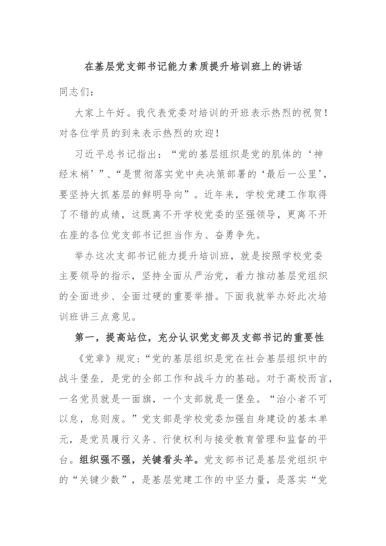/ 在基层党支部书记能力素质提升培训班上的讲话
