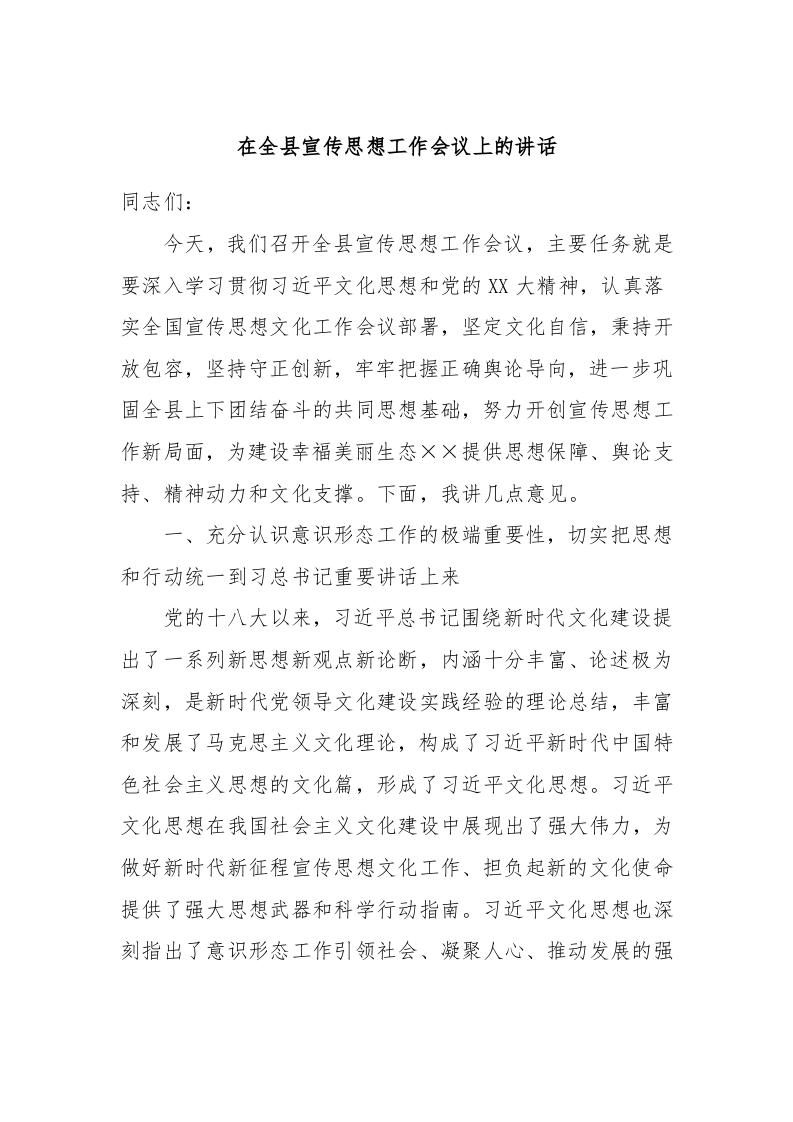 / 在全县宣传思想工作会议上的讲话